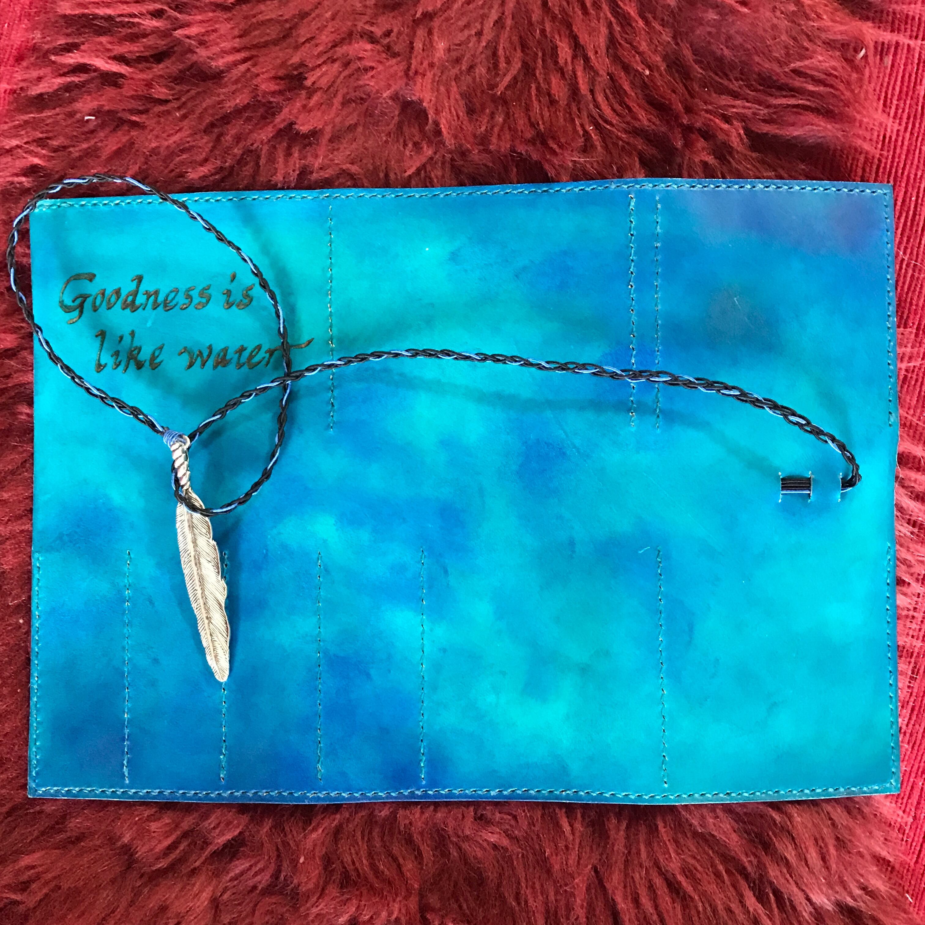 (この商品はオーシャンブルーをメインにした2色のグラデーション染め、お客様の好きな言葉をレザーバーニング)