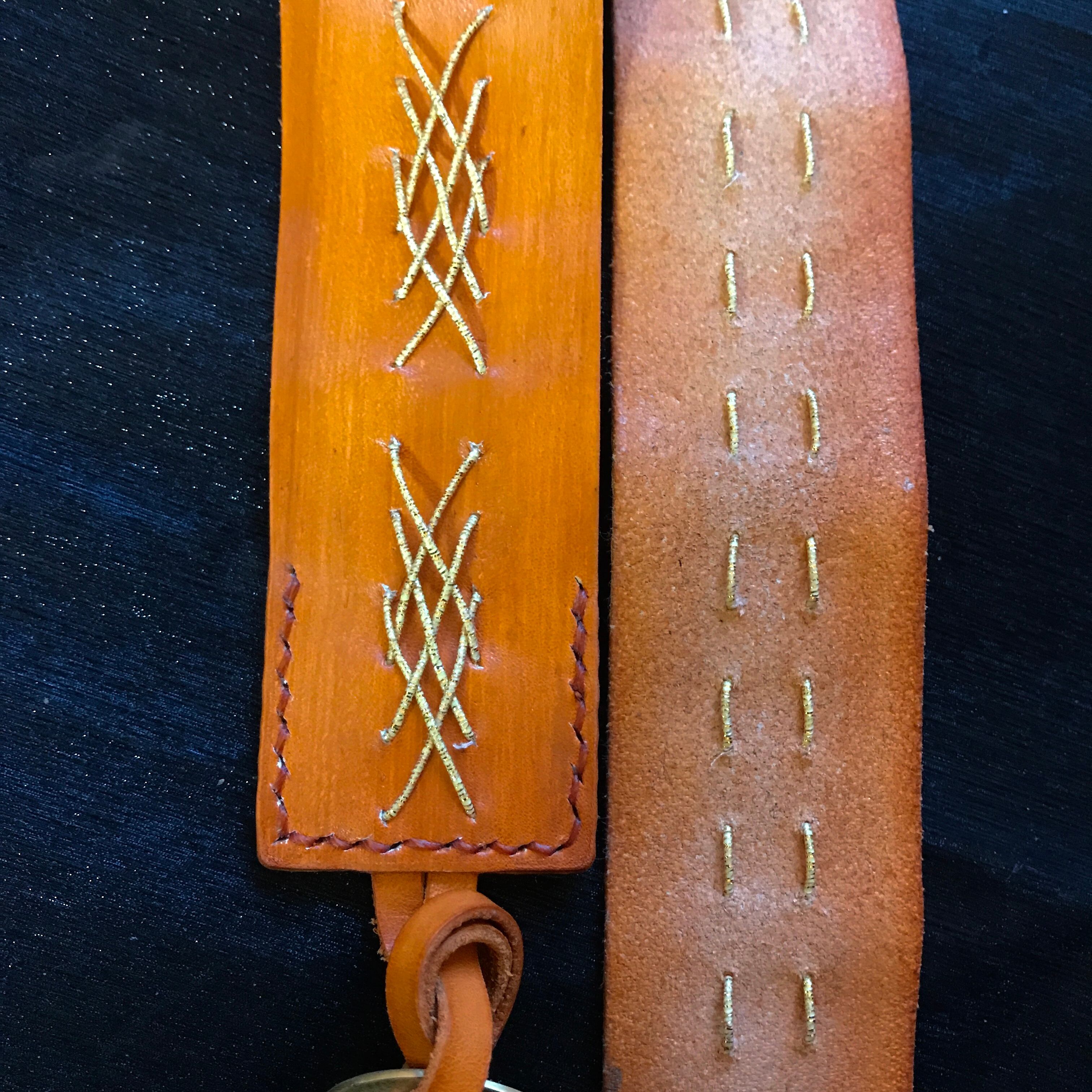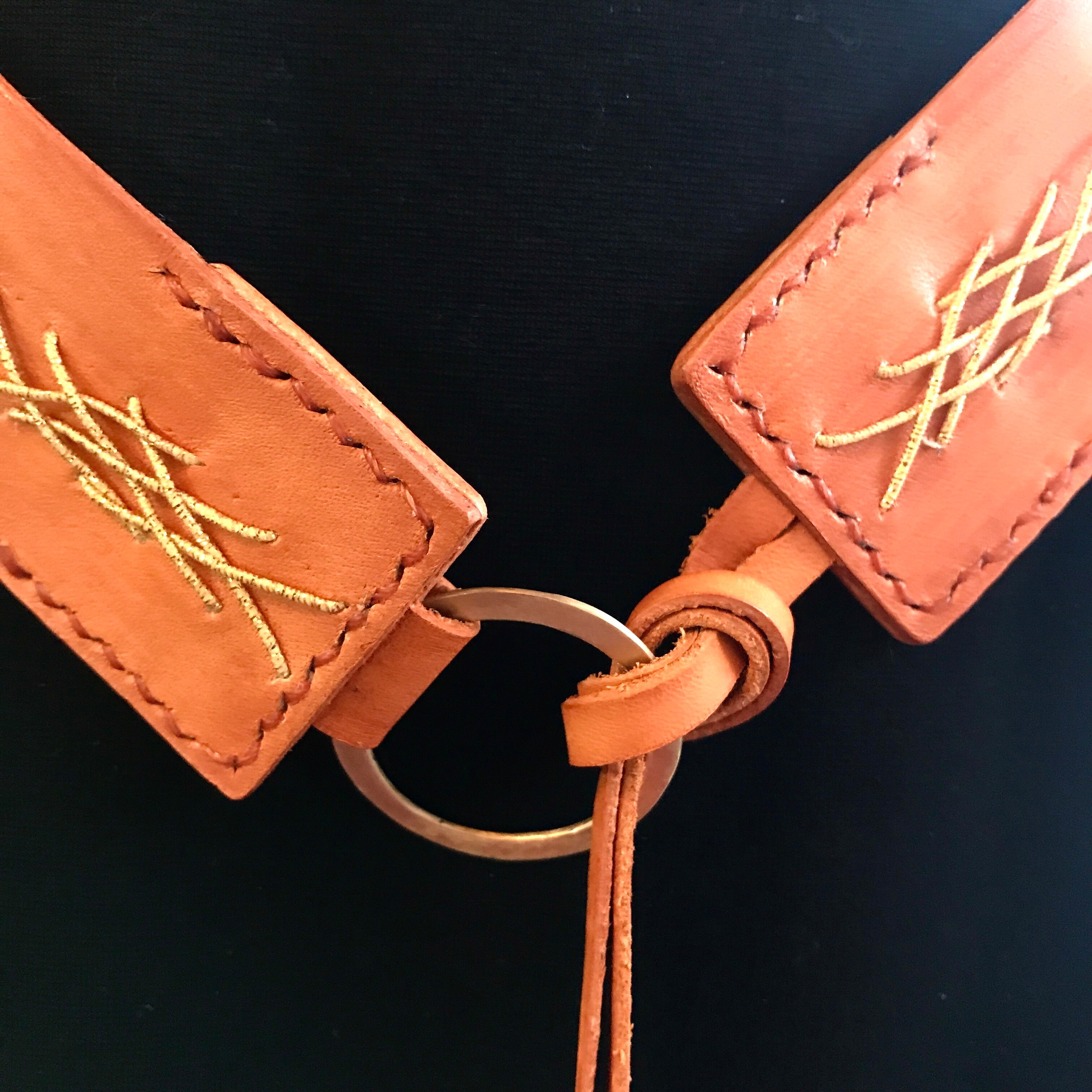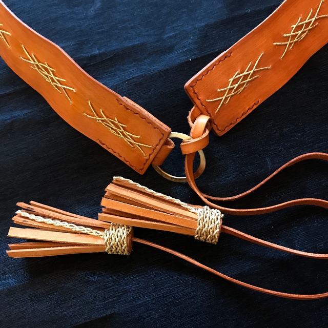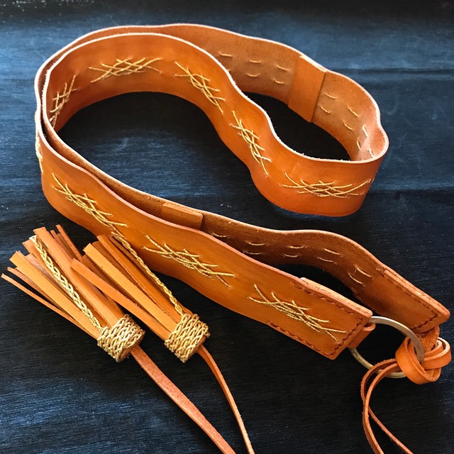 手染めのヌメ革に水引で刺繍を施したクラフト感溢れるベルト
