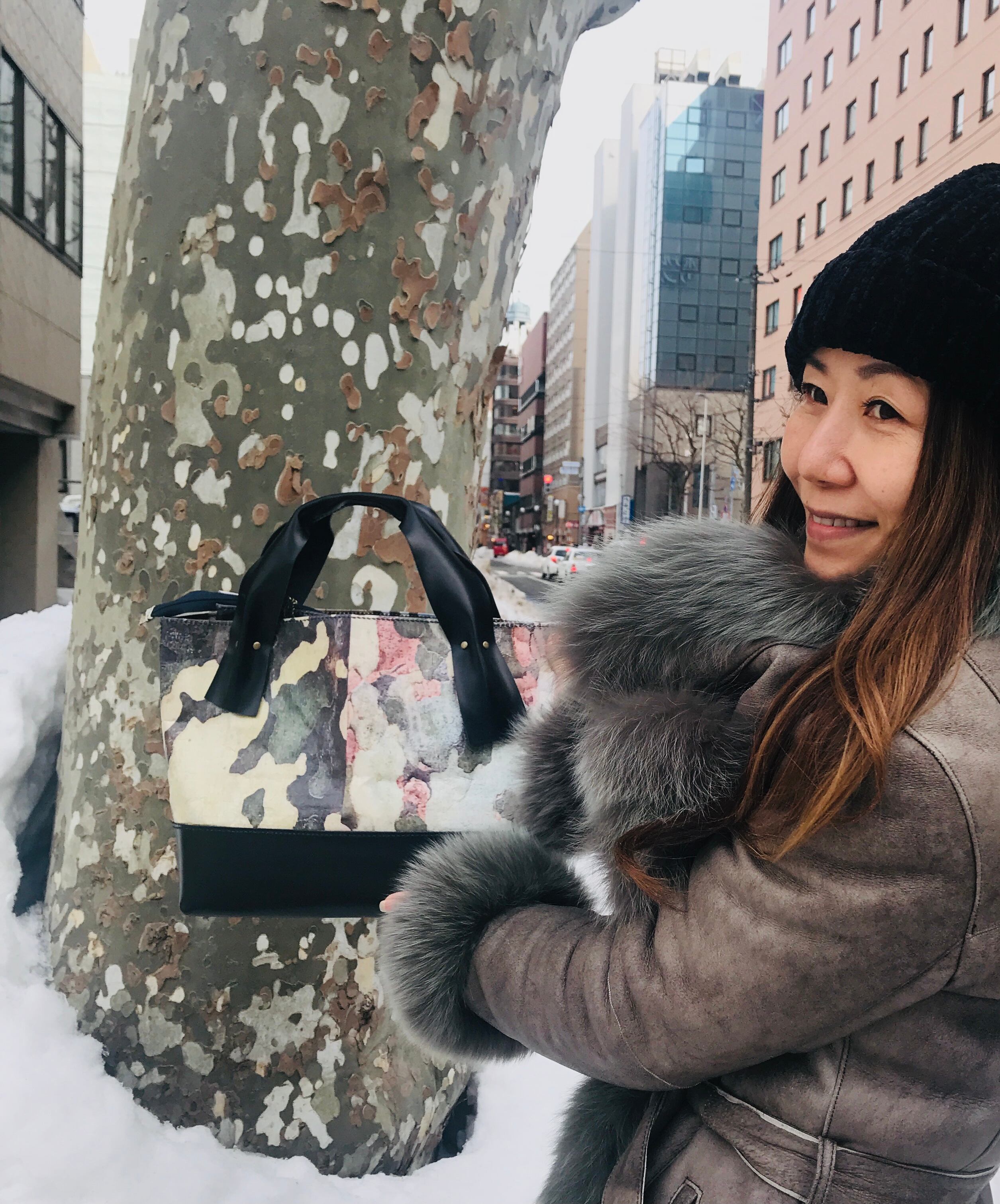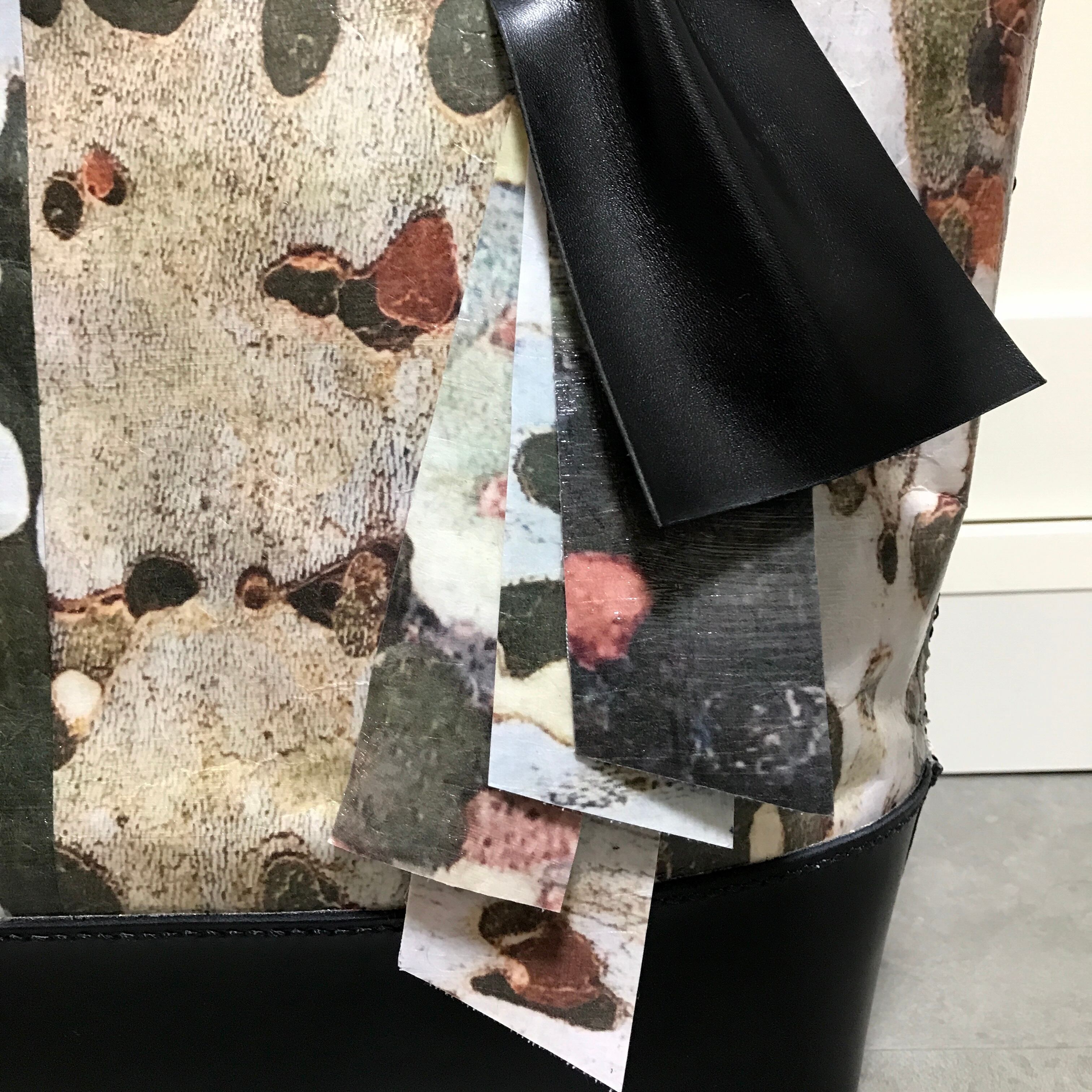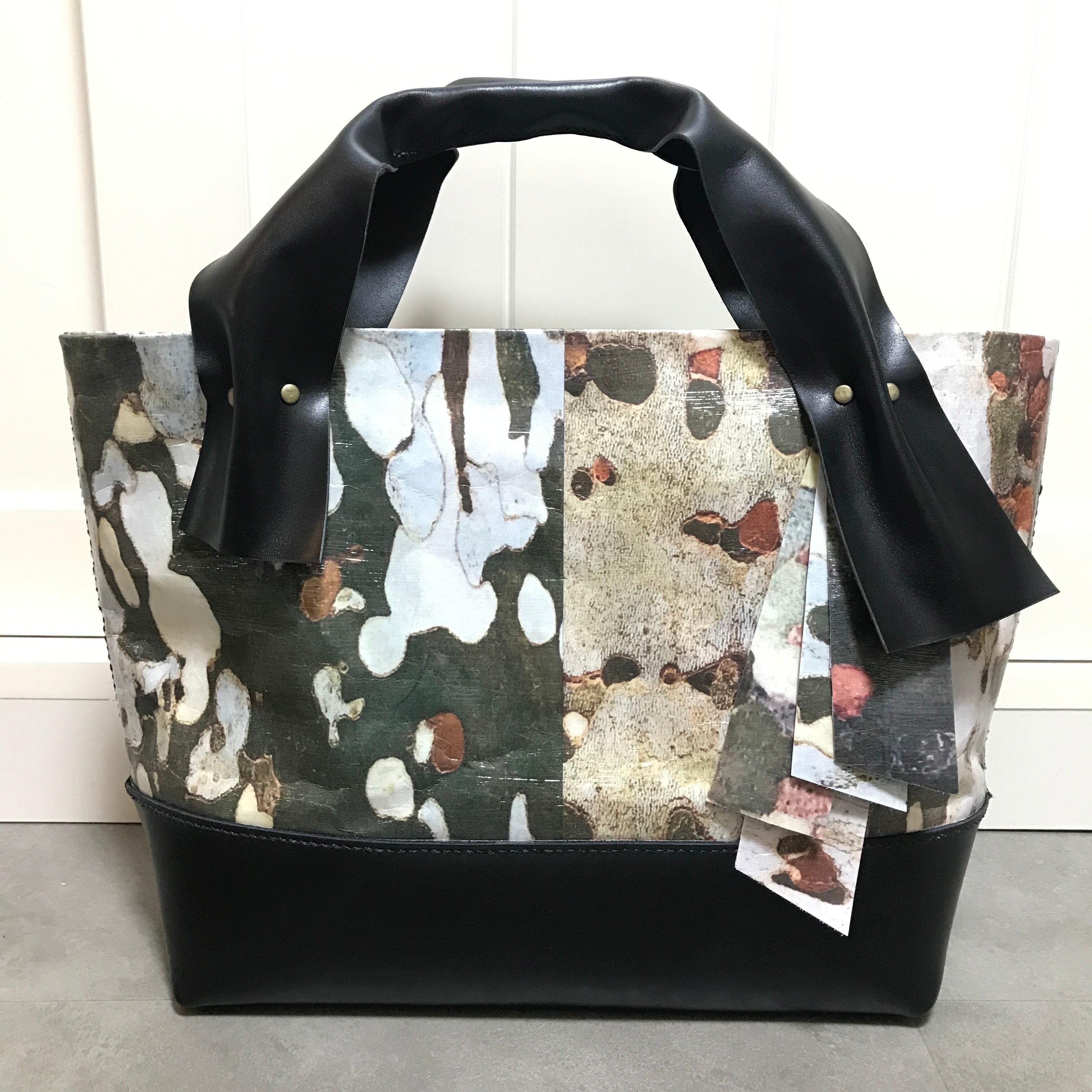 木肌がまさにカモフラ柄をそのもので美しいプラタナスの街路樹を写真に撮り、テキスタイルに加工、革と組み合わせてトートバッグに仕立てました