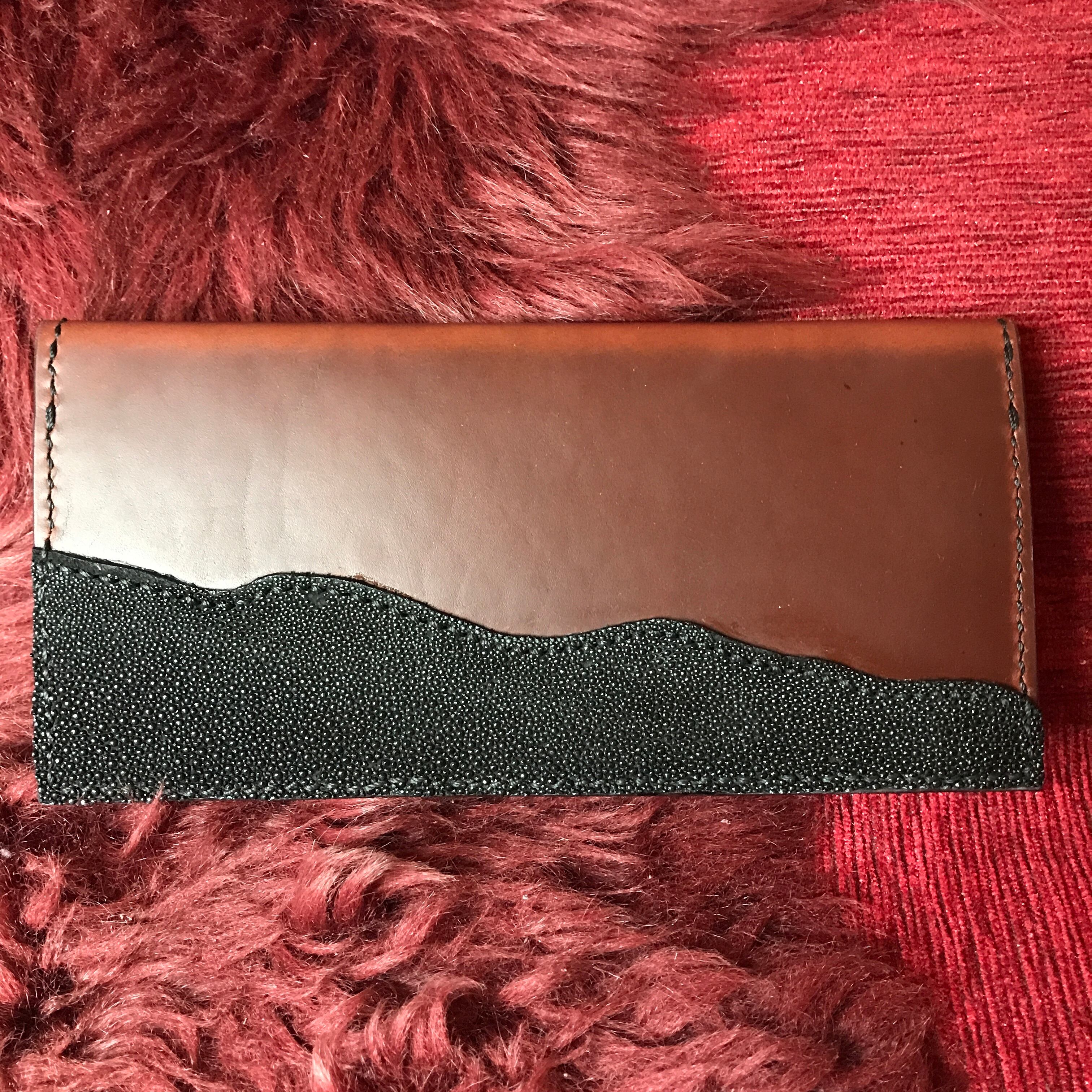 肉厚のオイルレザーをベースにスティングレイ(エイ革)を部分的に使用し、内側はヌメ革を手染めした長財布