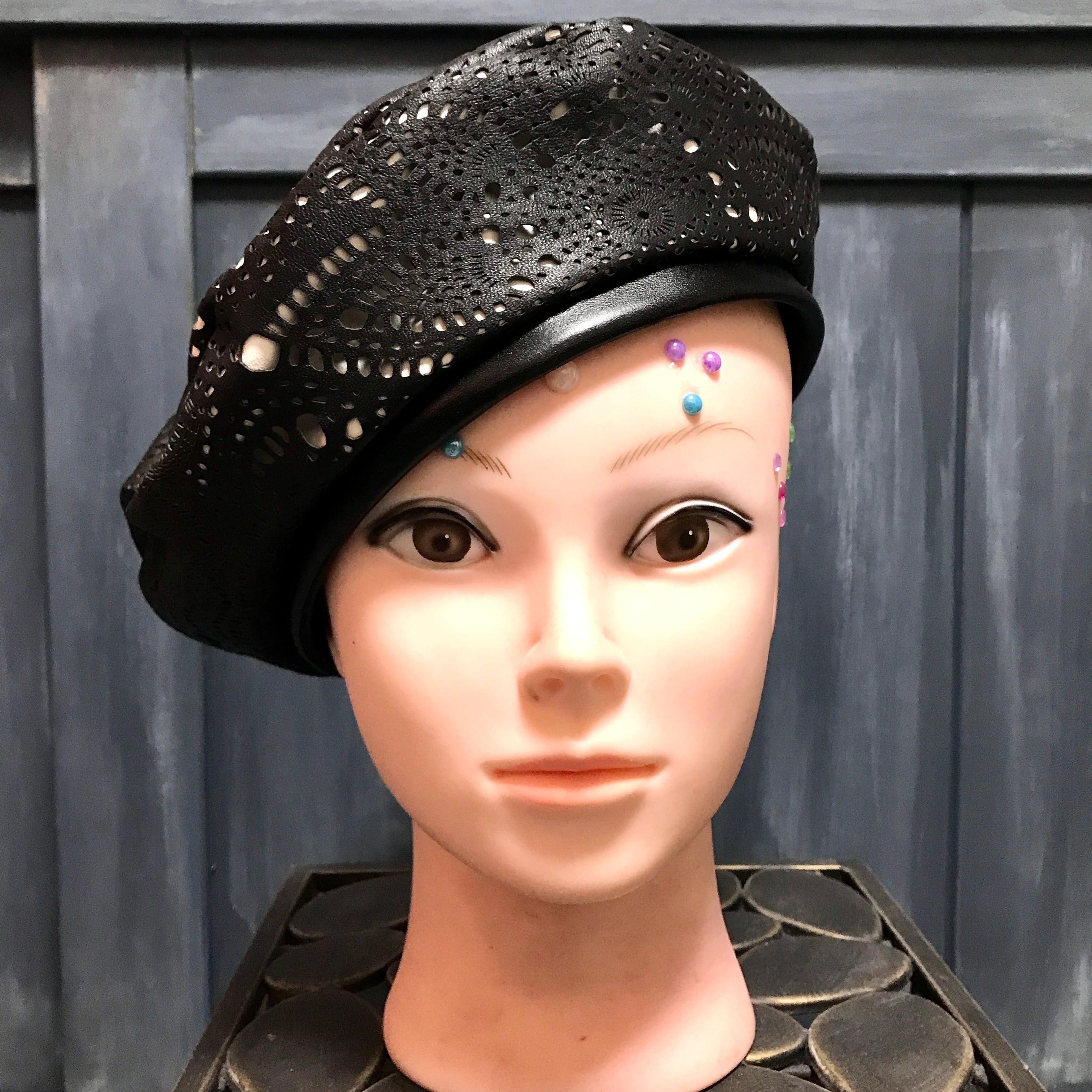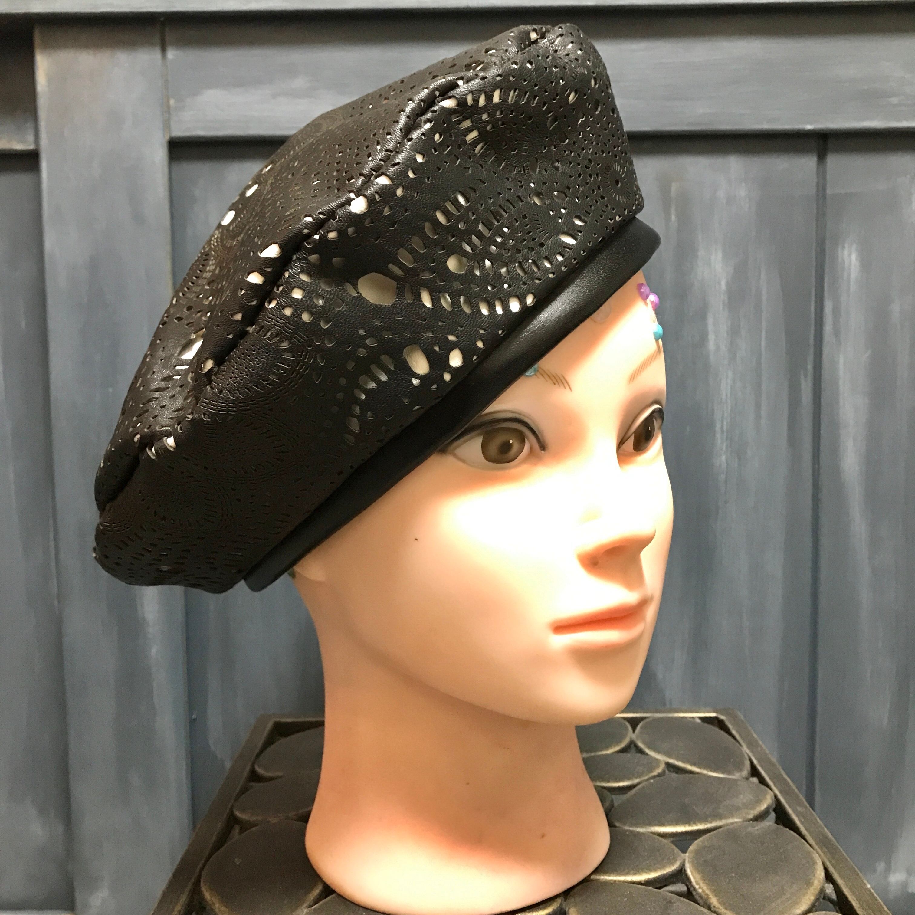 レースのようなパンチングを施した柔らかなブラックのラムレザーのベレー帽です