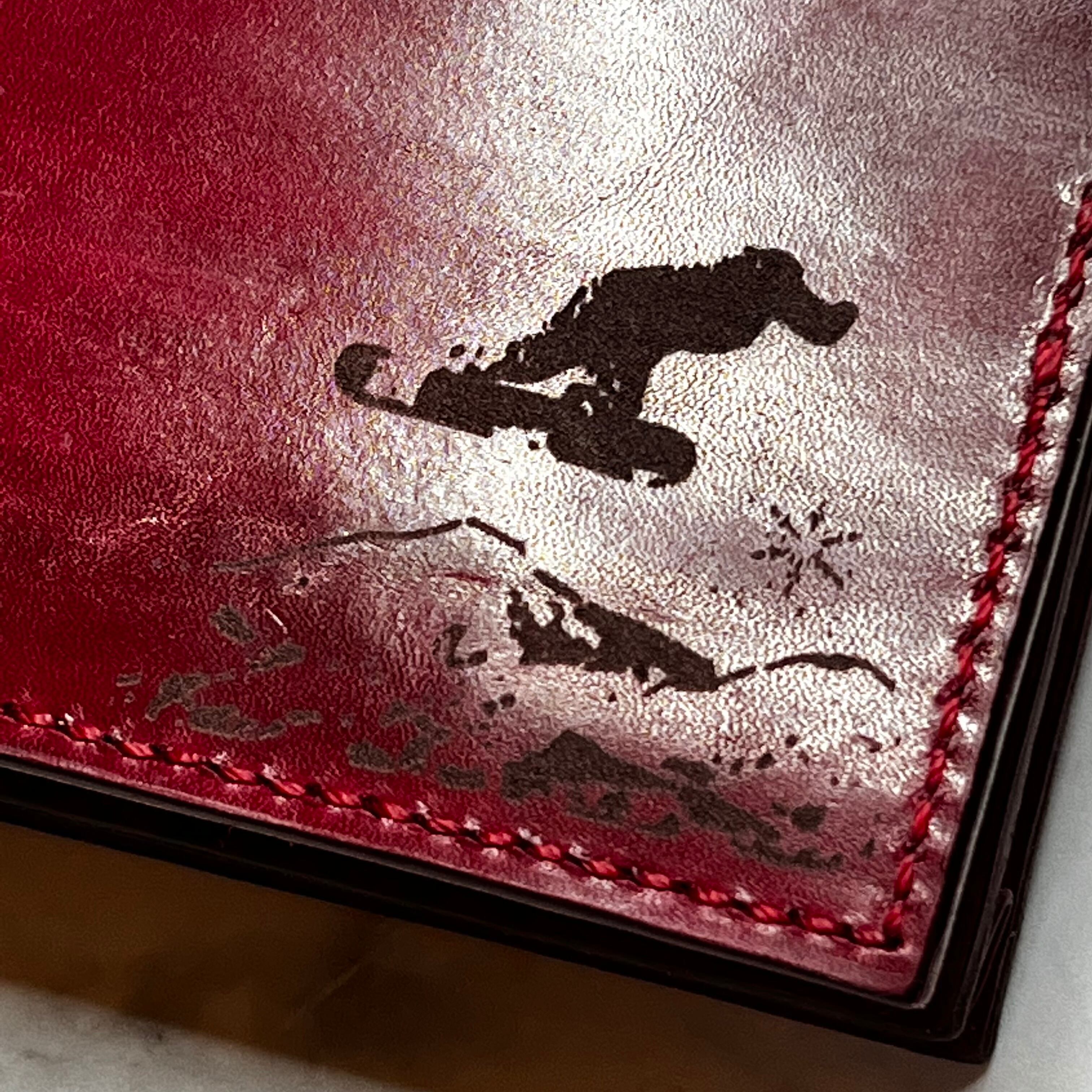 スノーボーダーの絵柄とイニシャルをレーザー彫刻で入れています