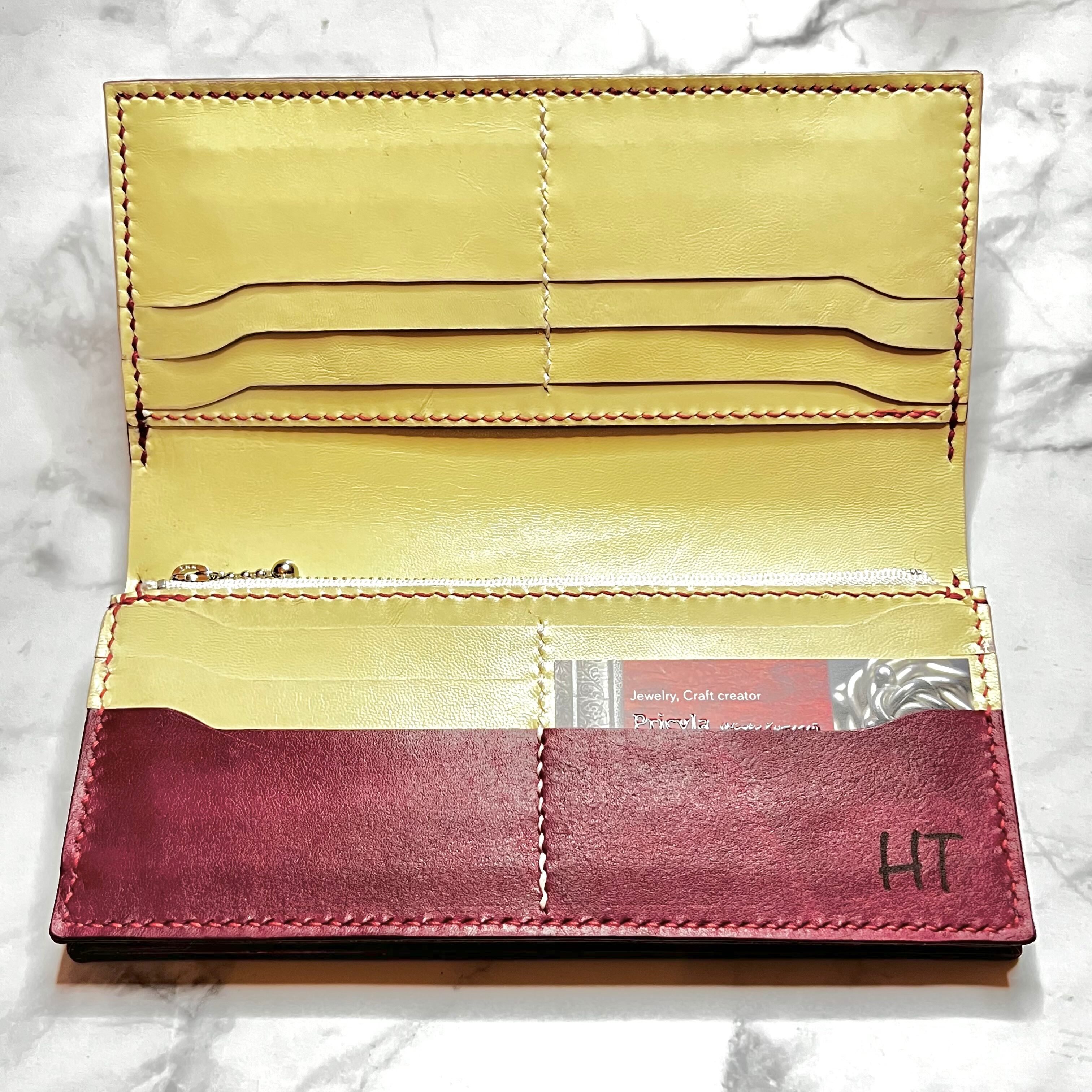 ヌメ革をご希望のカラーに染めた二つ折り長財布
